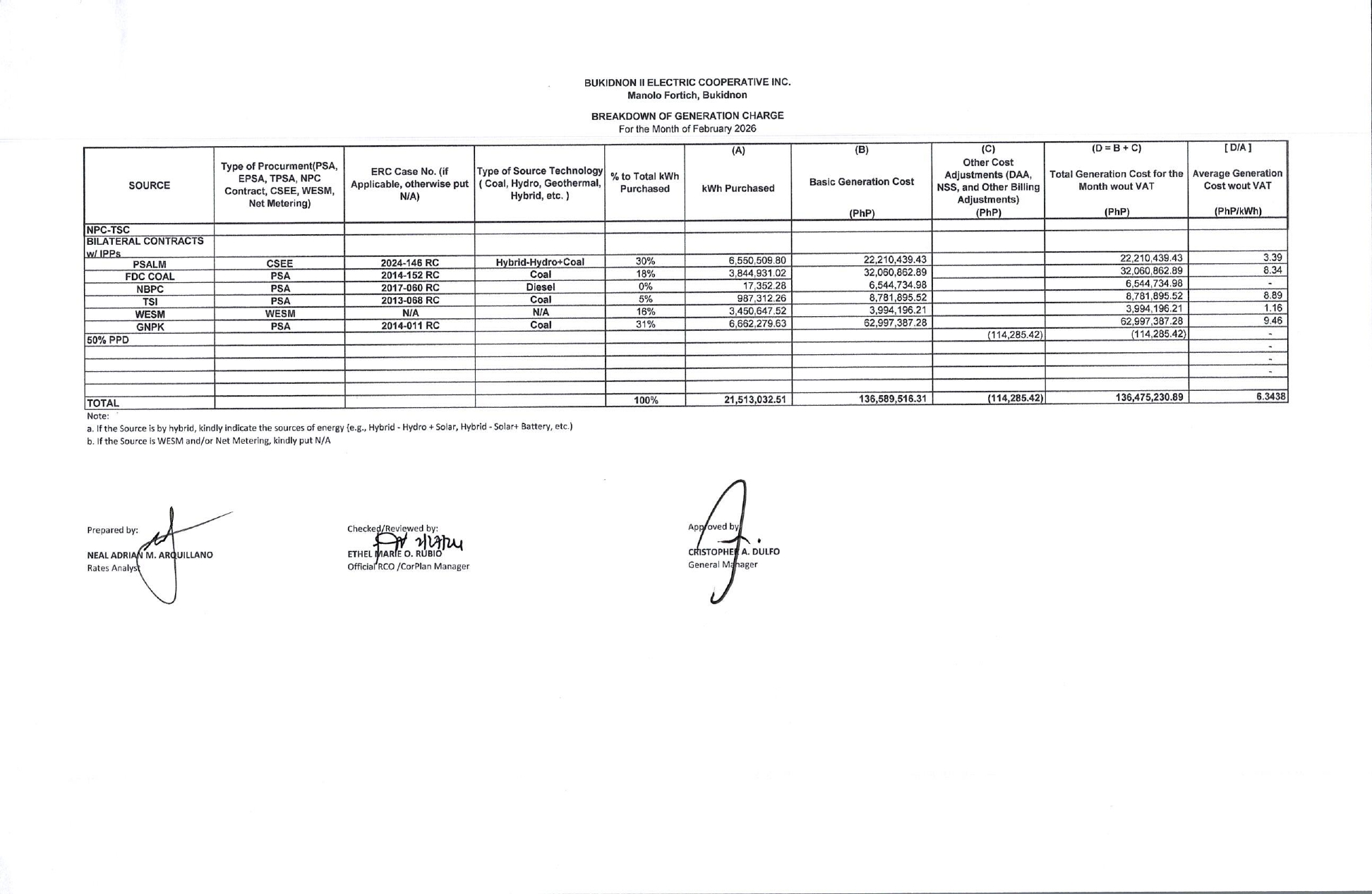 BREAKDOWN OF GENERATION CHARGE for the Month of February 2026