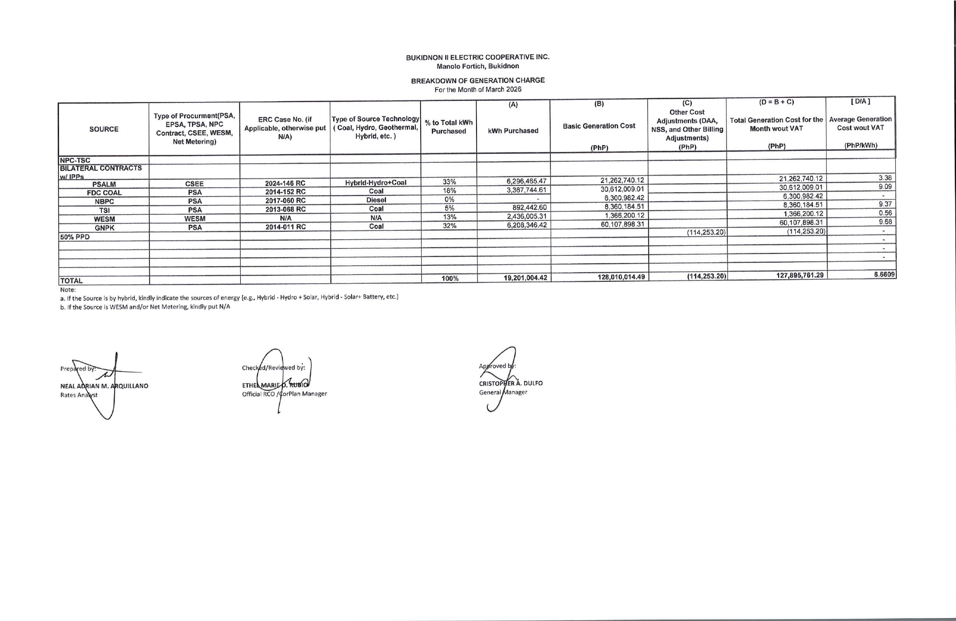 BREAKDOWN OF GENERATION CHARGE for the Month of April 2026