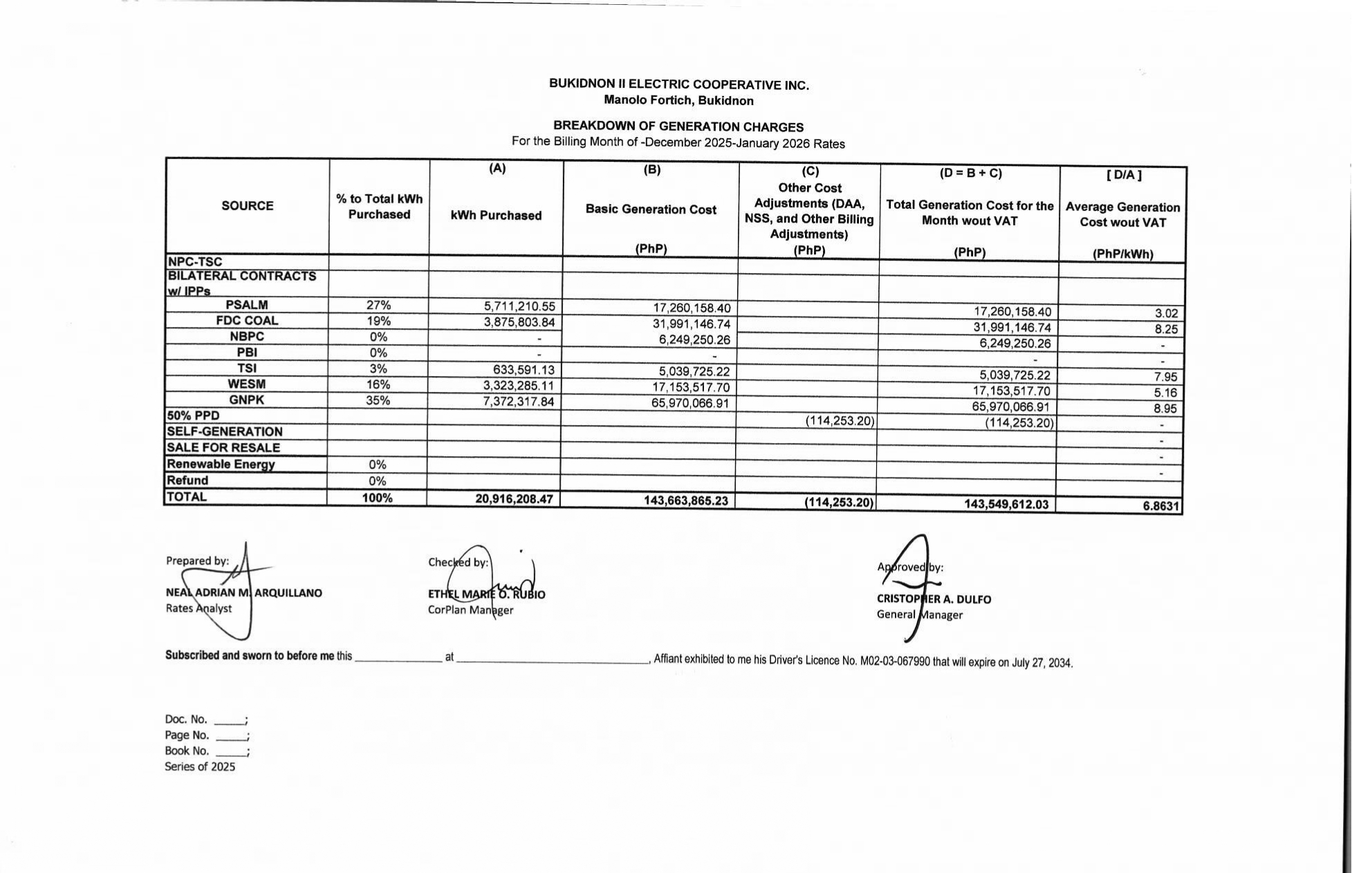 Breakdown of Generation Charges December 2025
