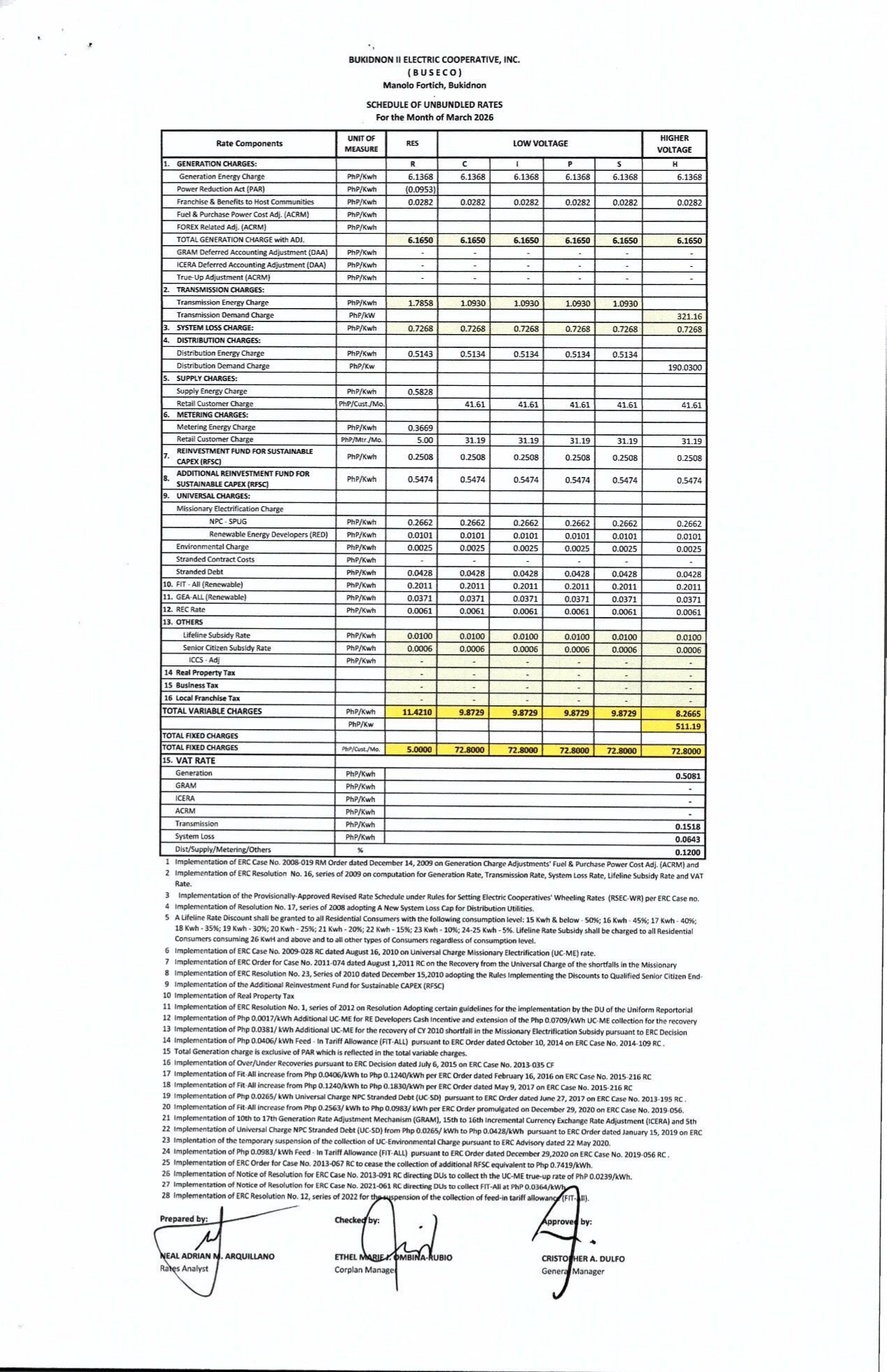 March 2026 Schedule of Unbundled Rates