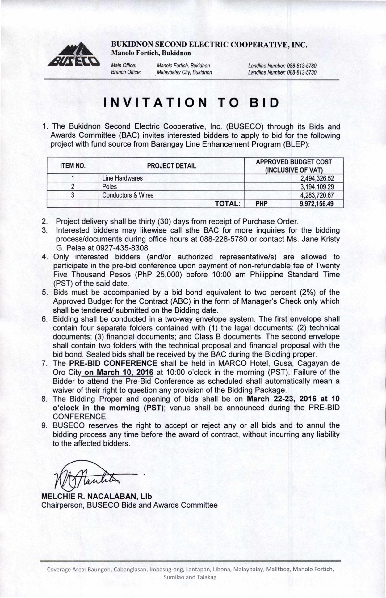 The Bukidnon Second Electric Cooperative, Inc. (BUSECO) through its Bids and Awards Committee (BAC) invites interested bidders to apply to bid for the following project with fund source from Barangay Line Enhancement Program (BLEP):