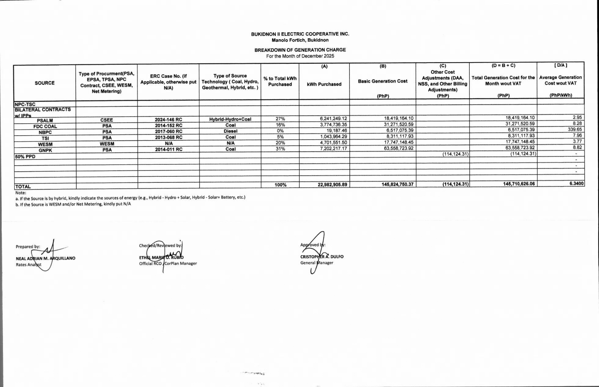 BREAKDOWN OF GENERATION CHARGE for the Month of December 2025