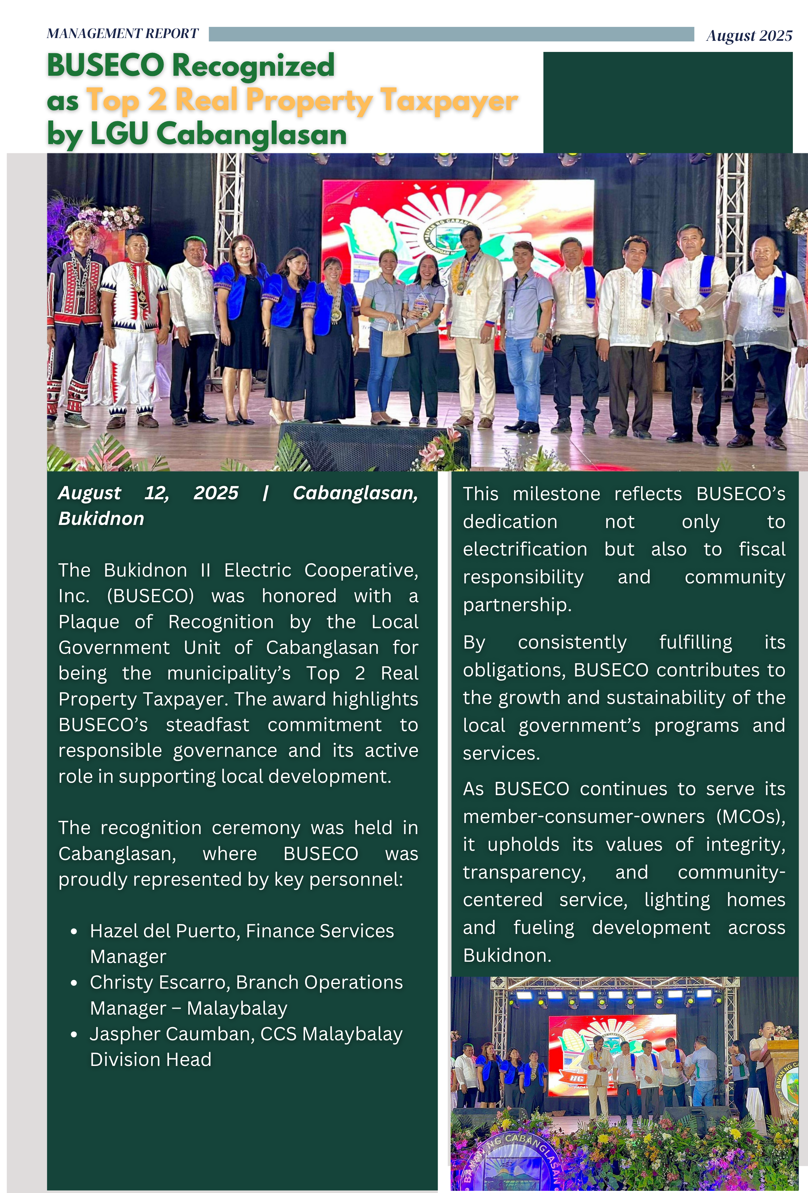 BUSECO Recognized as Top 2 Real Property Taxpayer by LGU Cabanglasan