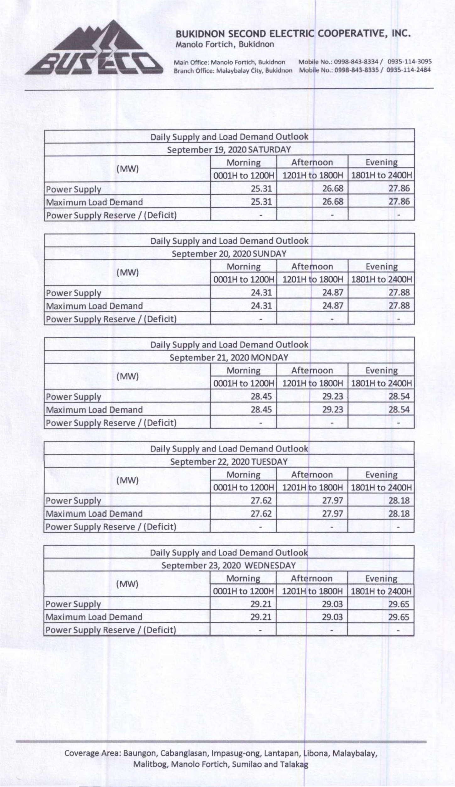 Daily Supply and Load Outlook (September 19 – September 25, 2020)