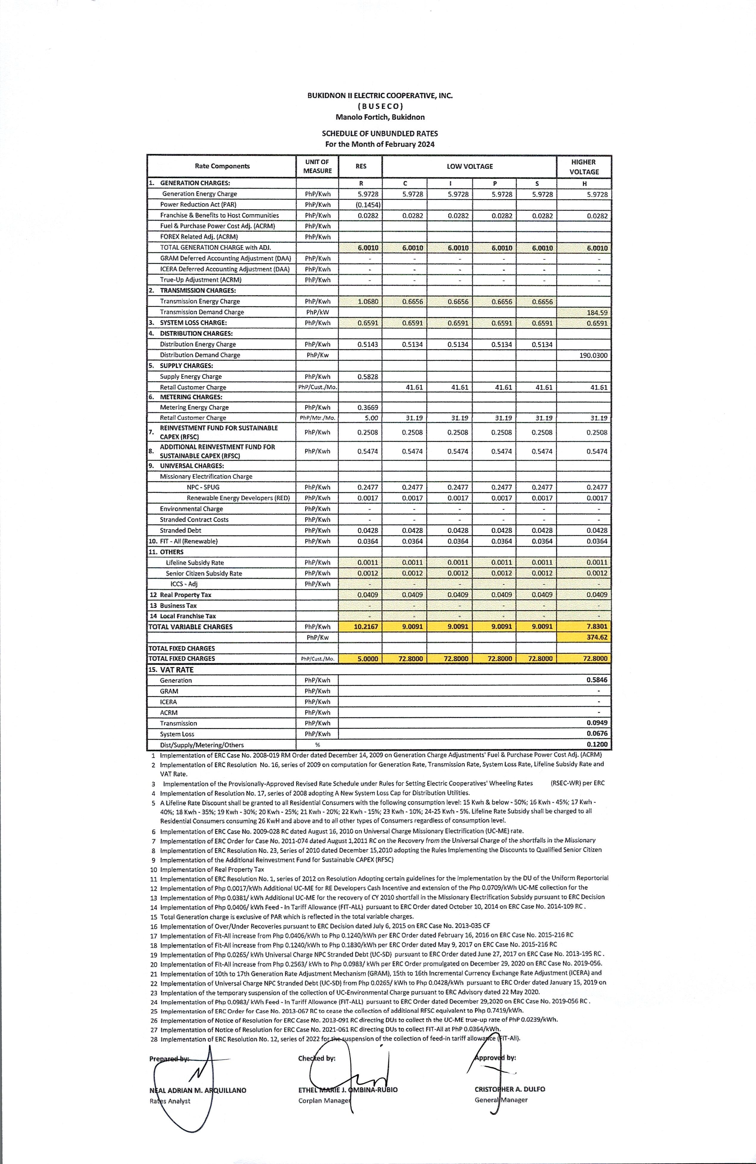 Febuary 2024 Schedule of Unbundled Rates