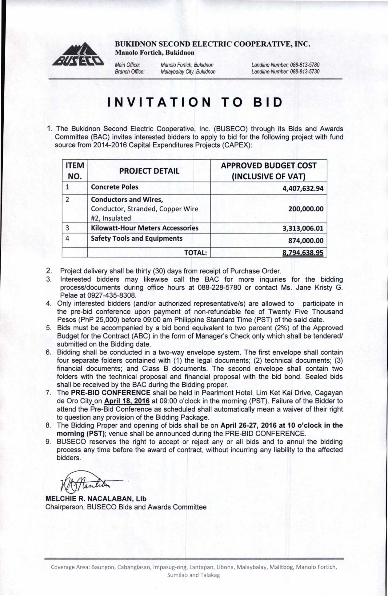 The Bukidnon Second Electric Cooperative, Inc. (BUSECO) through its Bids and Awards Committee (BAC) invites interested bidders to apply to bid for projects with fund source from 2014-2016 Capital Expenditures (CAPEX).