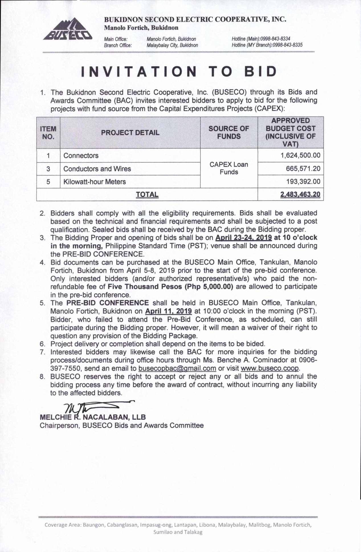The Bukidnon Second Electric Cooperative, Inc. (BUSECO) through its Bids and Awards Committee (BAC) invites interested bidders to apply to bid for the following projects with fund source from from the Capital Expenditures Projects (CAPEX):