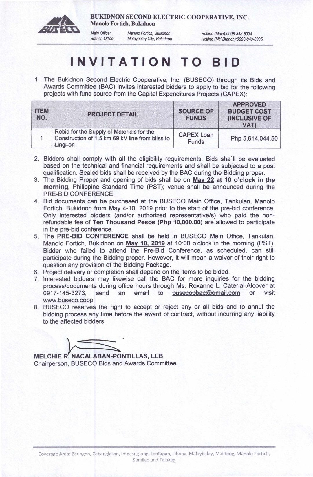 The Bukidnon Second Electric Cooperative, Inc. (BUSECO) through its Bids and Awards Committee (BAC) invites interested bidders to apply to bid for the following projects with fund source from from the Capital Expenditures Projects (CAPEX):
