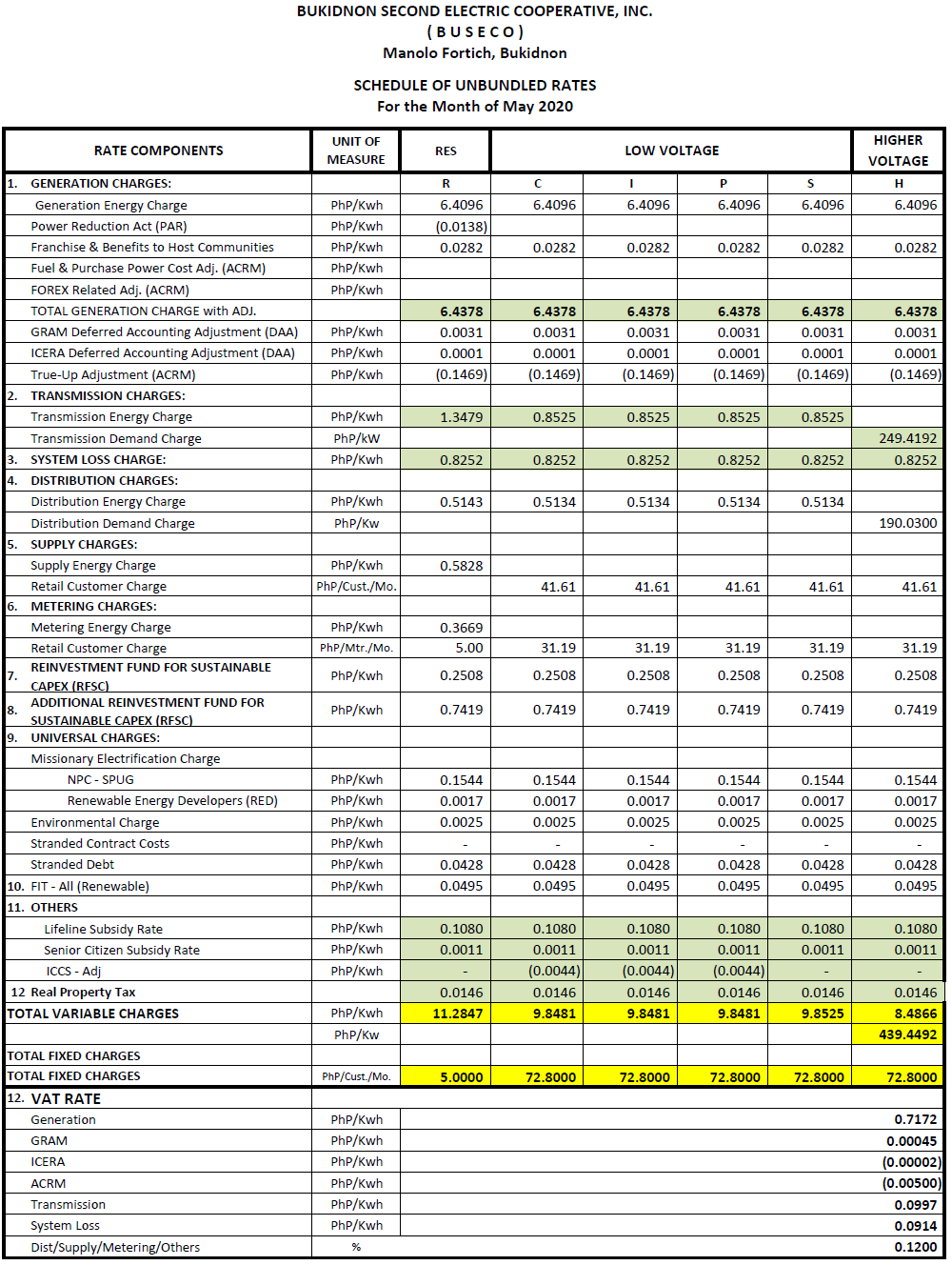 May 2020 Schedule of Unbundled Rates